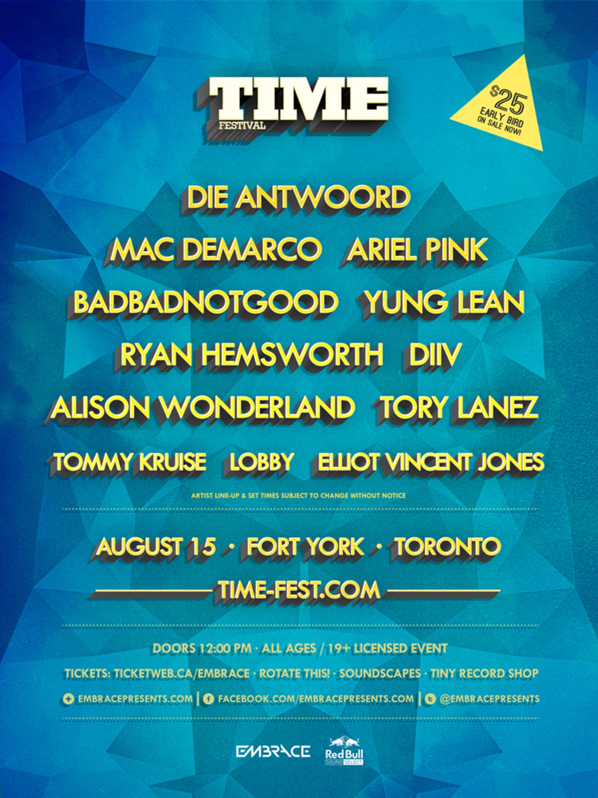 Check out the full lineup above. TIME Festival takes place on August 15th. You can buy early bird tickets here, for the mere price of $25 bones.