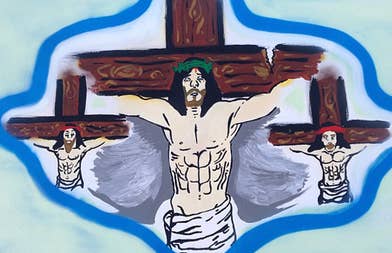 Yes, that is Jesus Christ on the cross and this is the caption: "Painting the way I feel today. Focus on what matters!"