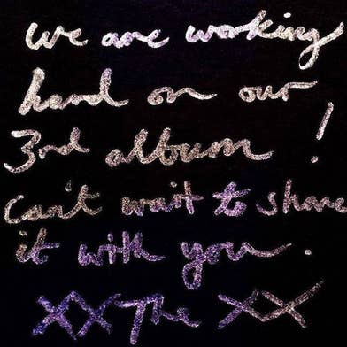 Although details are scant, The xx have once more confirmed their third album is underway. The group posted an update on Facebook with a glittery, seemingly handwritten note to supporters. It states as follows: