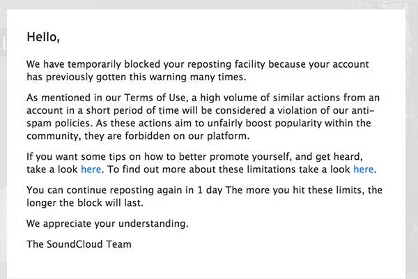 On receiving a reposting ban more than once, SoundCloud sends the following message: