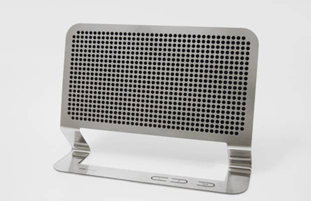 The speaker is made out of a singular slab of stainless that measures 0.5mm thick. When folded the sheet holds the flat speaker component in place. Buttons for playback and volume are located in the base.