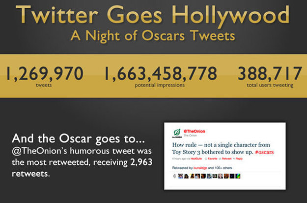 Peep the infographic to see the full breakdown. And to also see the most retweeted Oscar tweet of the night, which came courtesy of The Onion.