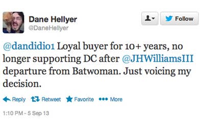This has been the case with JH Williams III and WH Blackman, the creative team on the company's Batwoman title. And while both DC Comics and JH Williams III have acknowledged that the marriage issue has nothing to do with the sexual orientation of the character, the marriage itself was explicitly banned by DC editorial. Publisher Dan DiDo has been taking plenty of flak from outrage fans on Twitter as a result of the decision and subsequent creative departure, with many DC Comics diehards claiming that they will stop buying from the company for good. Here's some of the best responses from outraged fans on Twitter.