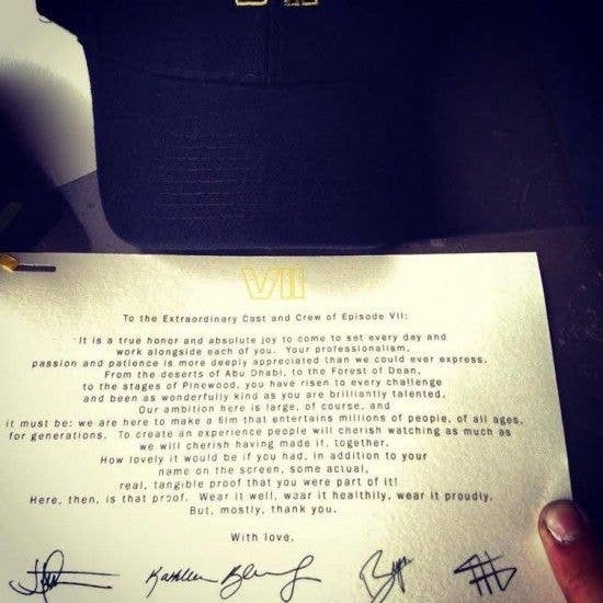"To the Extraordinary Cast and Crew of Episode VII: It is a true honor and absolute joy to come to set every day and work alongside each of you. Your professionalism, passion, and patience is more deeply appreciated than we could ever express. From the deserts of Abu Dhabi, to the Forest of Dean, to the stages of Pinewood, you have risen to every challenge and been as wonderfully kind as you are brilliantly talented. Our ambition here is large, of course, and it must be: we are here to make a film that entertains millions of people, of all ages, for generations. To create an experience people will cherish watching as much as we will cherish having made it, together. How lovely it would be if you had, in addition to your name on the screen, some actual, real, tangible proof that you were part of it! Here, then, is that proof. Wear it well, wear it healthily, wear it proudly. But, mostly, thank you. With love, J.J. Abrams, Kathleen Kennedy, Bryan Burke."