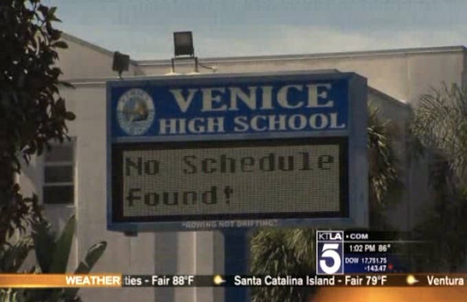The Los Angeles Times reports that eight of teens were arrested on the campus of Venice High School yesterday morning, while the other was arrested at an off-site location. The LAPD is still searching for the five remaining suspects, and all of the boys involved are said to be between the ages of 14 and 17. A parent reported the alleged sexual assaults on Tuesday, triggering the investigation: