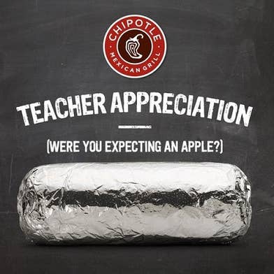 Teacher's don't get enough credit, and Chipotle knows this. In honor of Teacher Appreciation Day, any who present a valid school I.D. will be treated to a free burrito, burrito bowl or salad with the purchase of another from now until close: