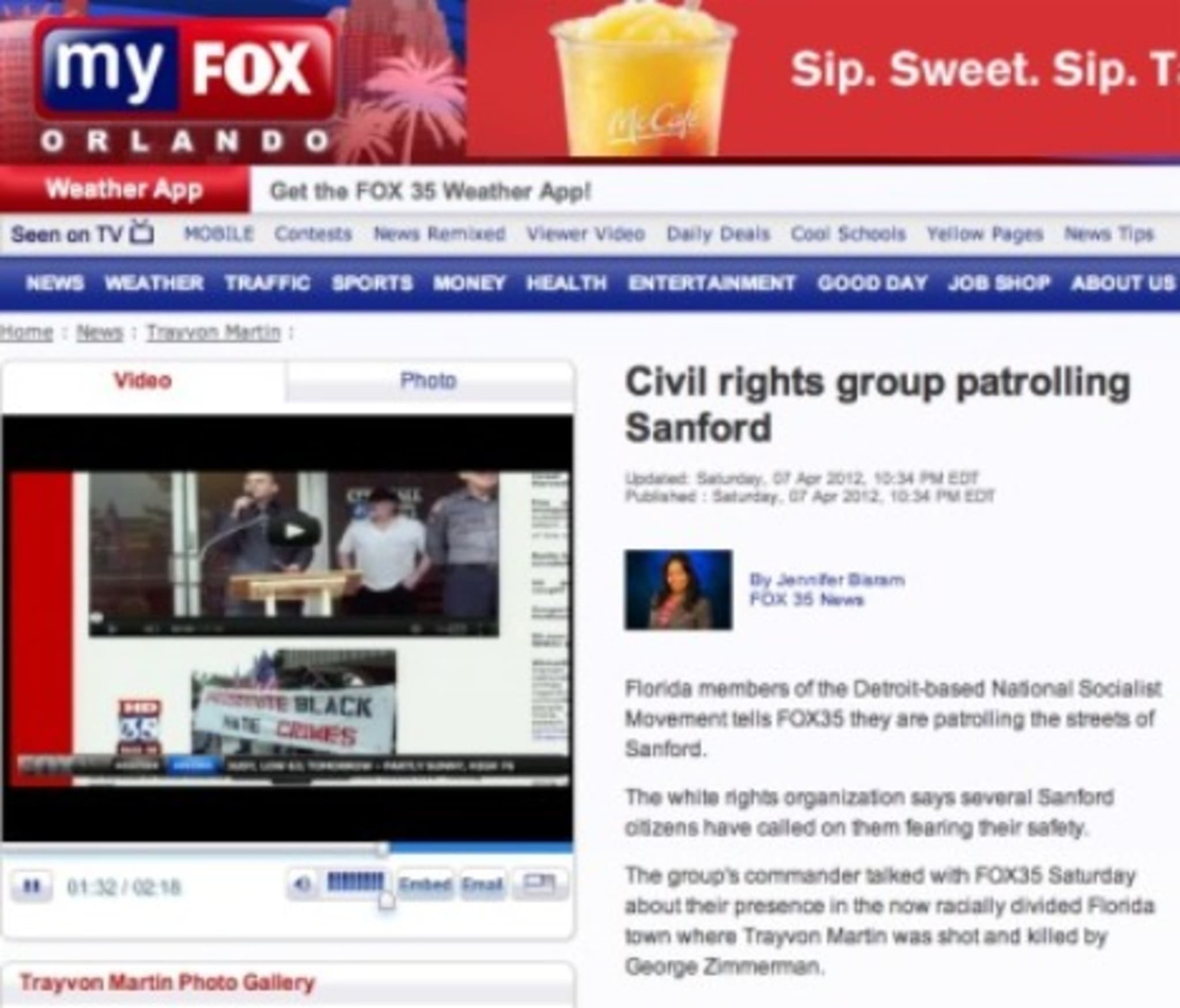 Despite the swastika, Fox 35 in Orlando apparently failed to realize that a neo-Nazi organization patrolling the streets of Sanford, Florida—where Trayvon Martin was killed—to “protect white citizens” was actually a neo-Nazi organization.