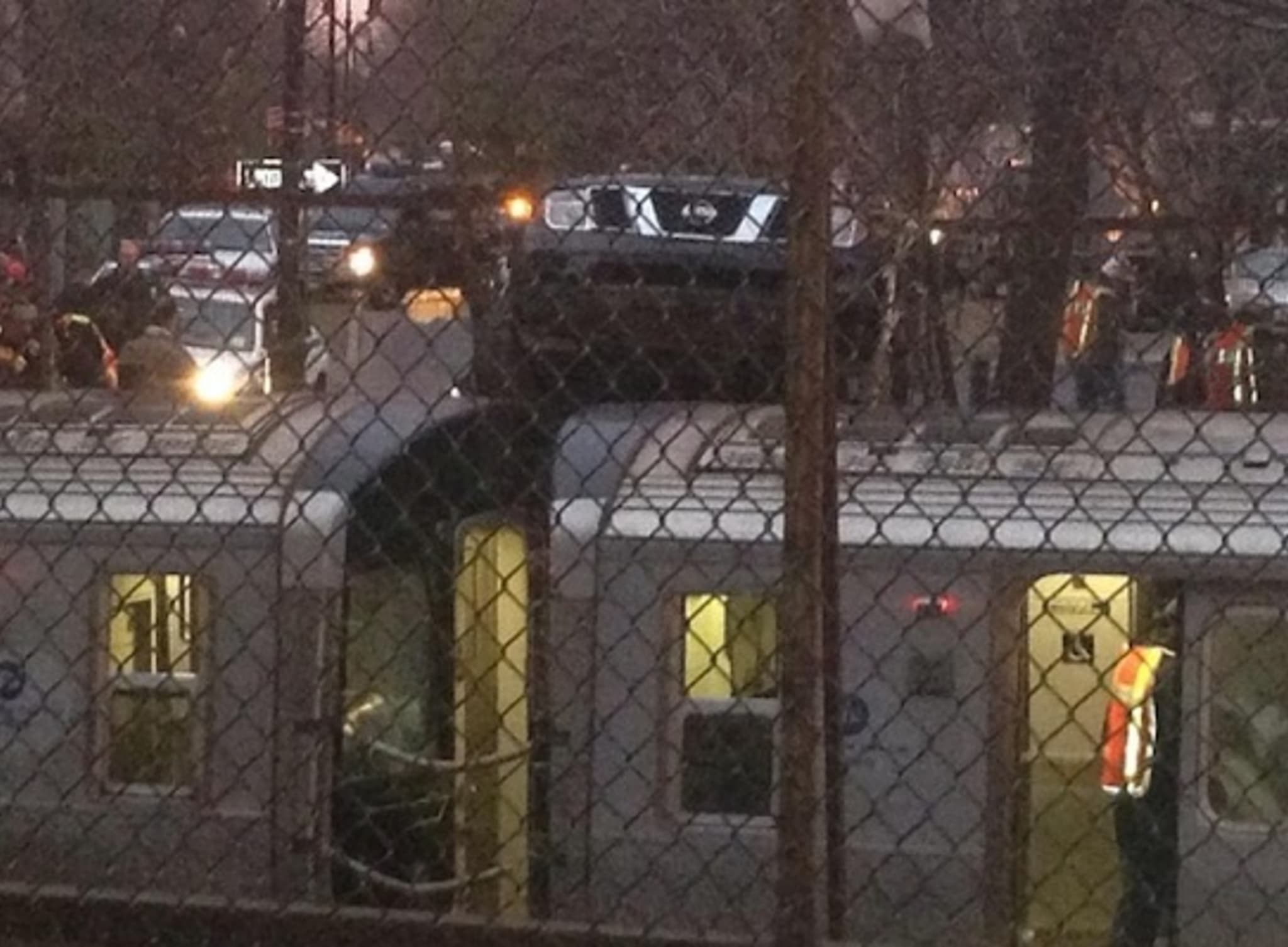 The vehicle was reportedly driving through Ditmas Park around 5:20 a.m. when it crashed through the fence, ultimately resting on top of a moving Q train. An NYPD spokeswoman told Gothamist that the driver is still at large after fleeing the scene.
