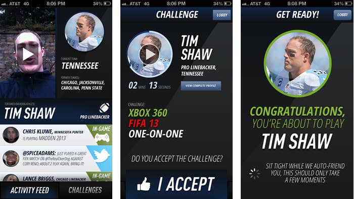 The way it works is that you download the mobile app (iOS, Android a bit later), punch in your gamertag or PSN name and you'll start to receive challenges from the athletes. If you accept, you may be randomly selected to play against the player who issued the challenge. After that happens, you'll be automatically "friended" from the athlete's Live or PSN account and entered into a match up. Video of the bout is recorded as well so you can relive the moment whenever you want.