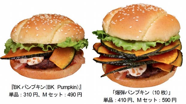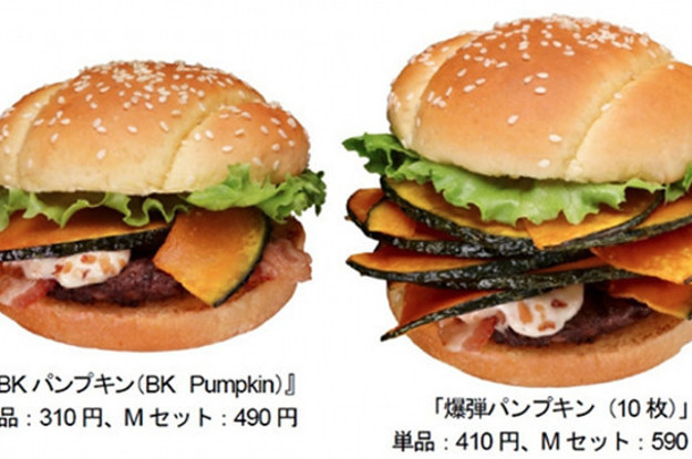 Burger King Japan is rolling out a pumpkin burger to capitalize on fall: slices of fried kabocha squash (a squash native to Japan similar to pumpkin), bacon, a beef patty, lettuce, and a sauce made from sesame seeds, peanuts, almonds, cashews, and hazelnuts.