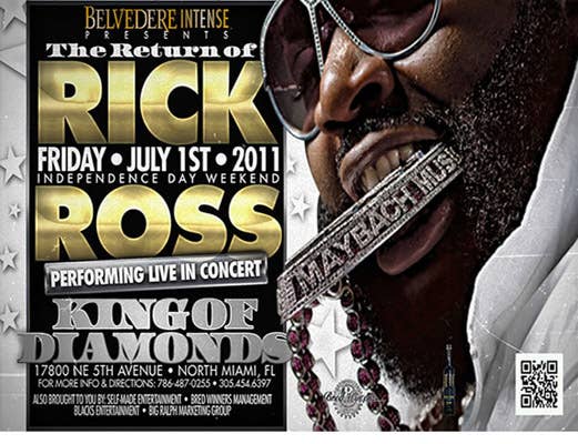 What remains to be said that hasn’t already been? A few years ago, this man was one of hip-hop’s most thorough contradictions (a former corrections officer portraying himself as an uber-criminal in Miami’s drug world), ridiculous lyrics (“I weigh 300 pounds/And it’s time to eat”) and over-the-top videos (Ross’s daring dive off a bridge at the intro to the “Speedin’” video). Somehow, his self-proclaimed prophecy has come true: if you can’t come across a song with Rick Ross on it while you’re scanning the radio, something is wrong. Which means he can now do anything he wants to. Including have his July 1 performance at King of Diamonds, his favorite strip club. Which is exactly what he's doing.