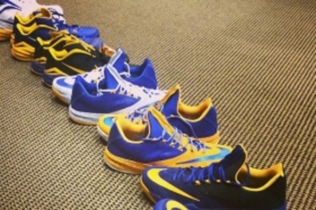Pictured are six different Warriors-inspired make-ups of the Zoom Run the One and Hyperdunk 2014 Low. Iggy's logo is printed on the heel of the Run the One and tongue of the Hyperdunk 2014. Non-PE versions of both models are available at Nike Basketball retailers now.