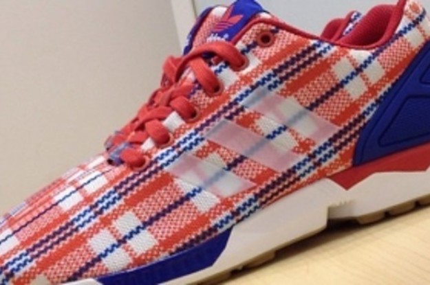 The shoe sports a red, white and blue tartan printed upper, supported by a sold blue cage. Below sits a white midsole and gum outsole.