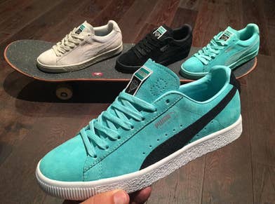 Previewed by Nicky Diamonds, the collection consists of Suedes and Clydes in teal, cream and black-based colorways. Each shoe is branded with a Diamond tongue tag and custom print on the quarter.