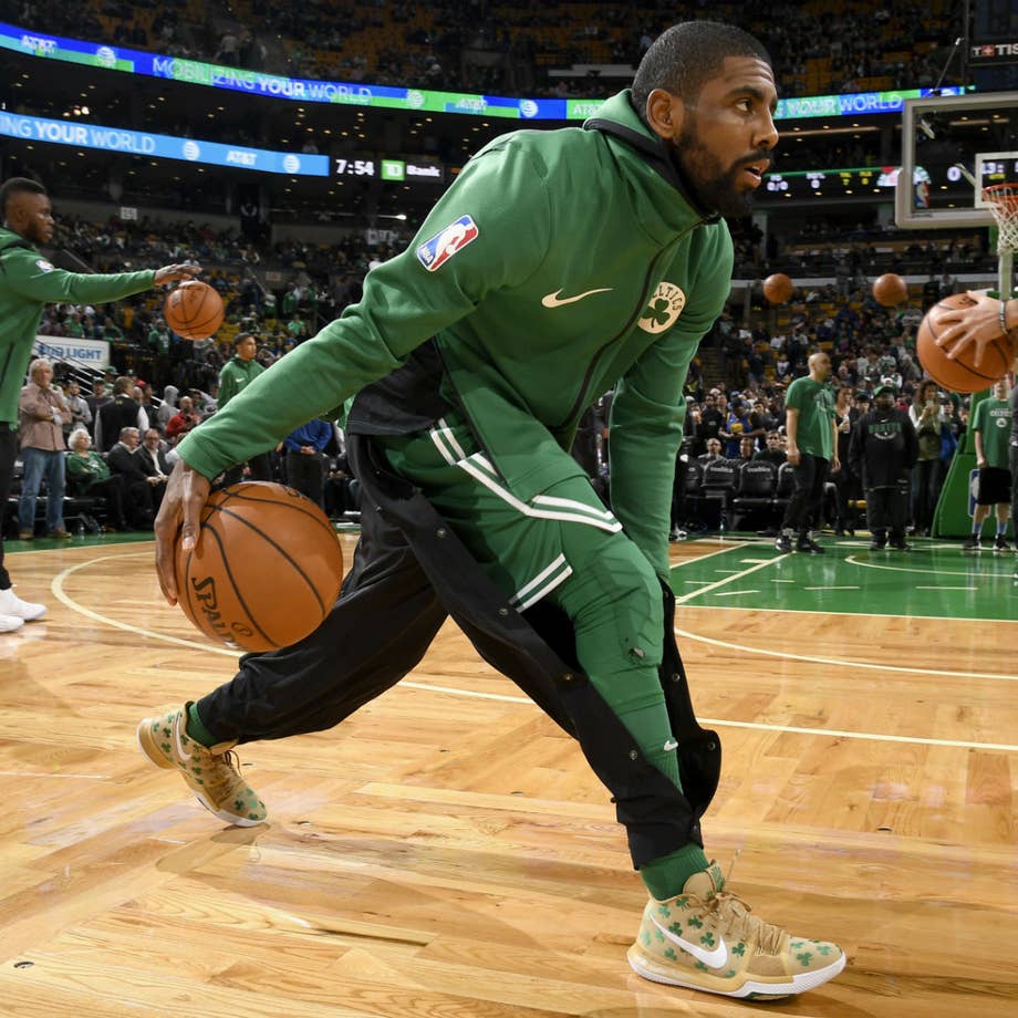 Down as many as 17, the Celtics stormed back to pull out a 92-88 victory at the Garden. Irving, who came alive late, finished with 16 points, 5 rebounds and 6 assists. He did his work in two different colorways of the Kyrie 3—the "Luck" player edition releasing at House of Hoops tomorrow and the "Mom" Sneaker Room collaboration expected to be available in some capacity soon.