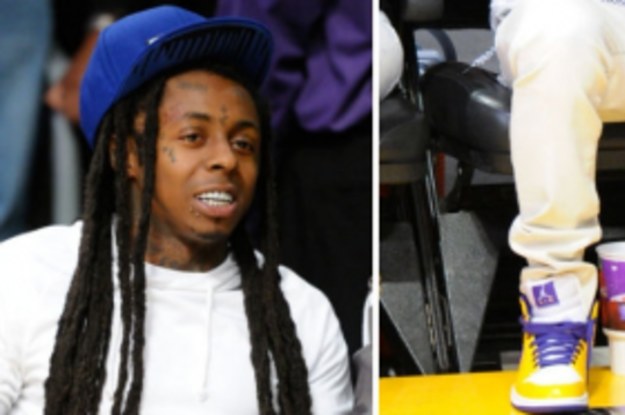 For yesterday's shellacking, Wayne rocked the "Lakers" colorway of the Air Jordan Retro 1 Mid. Weed carrier Young Money artist Mack Maine laced up BHM Spizikes. Check out a few shots below.