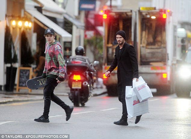 International soccer star David Beckham was spotted today in London wearing what appears to be an adidas Yeezy Ultra Boost hybrid. The design basically looks like the adidas Ultra Boost upper paired with the chunky sole of the Yeezy 350 Boost. Beckham's son Brooklyn also has a pair.