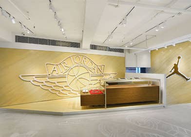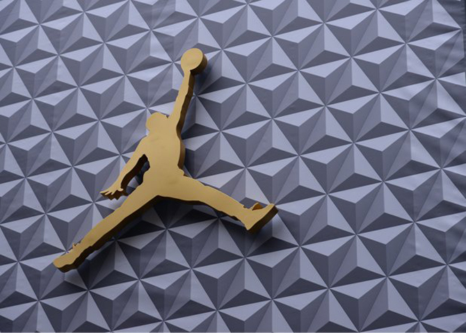 The storefront makes the brand's presence known between the jumbo Jumpman logo in gold and the massive recreation of the iconic "Wings" Michael Jordan poster. Inside is a clean build featuring a white/gold color story that's anchored by a set of gold Air Jordan models from 1 to XX9.