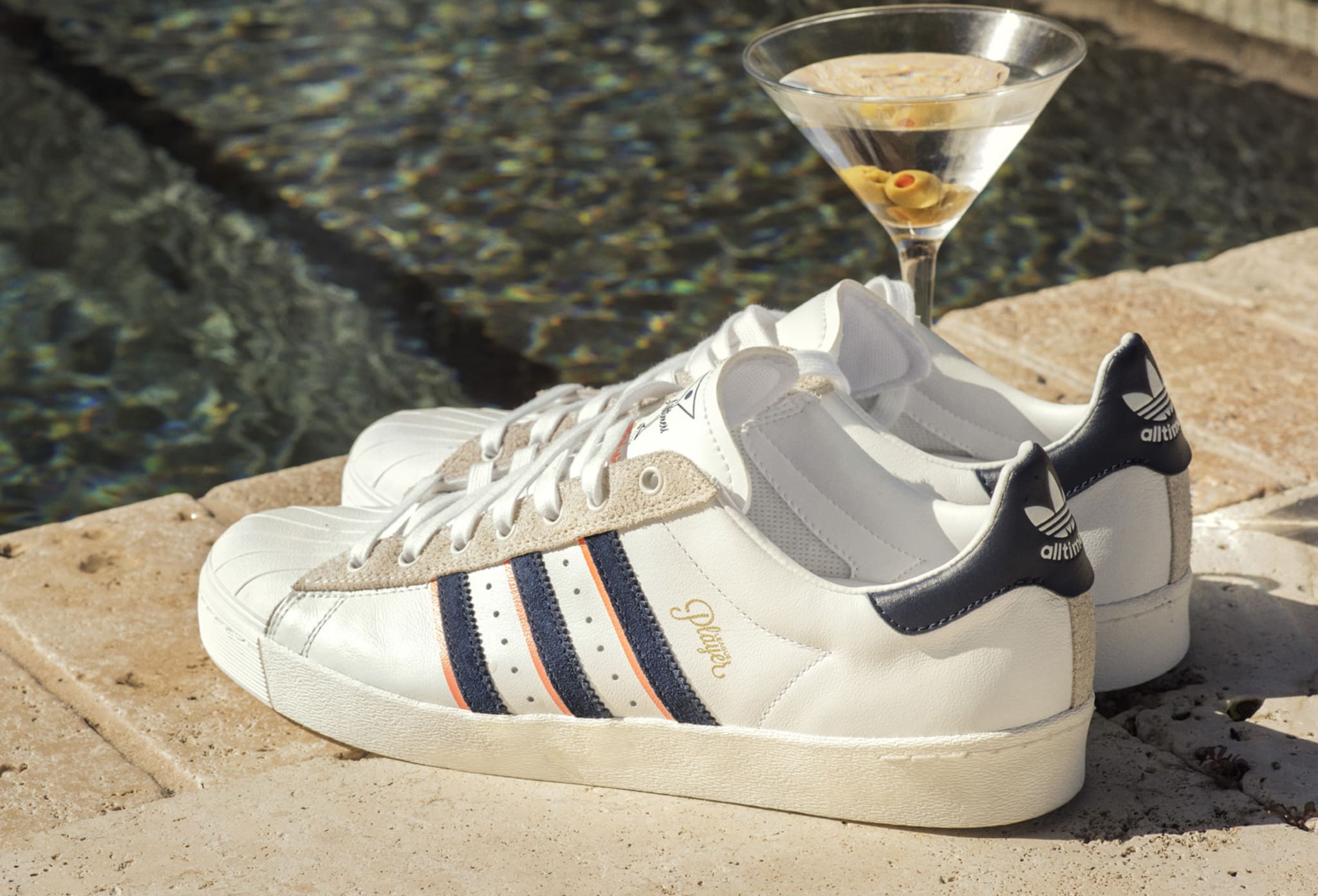 The adidas Superstar Vulc used for the project gets its inspiration from 1981's adidas Hogan, a shoe made for racquetball champ Marty Hogan. In place of his name on the side of the shoe there's a golden "Player" script.