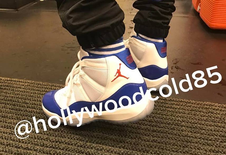 Remember those Air Jordan 11s that Chris Paul was spotted in during preseason warm-ups last year? CP3 brought the sneakers out again on Thursday night, revealing more of the Clippers colorway. The new angles of the shoe show red detailing on the Jumpman and heel numbering.