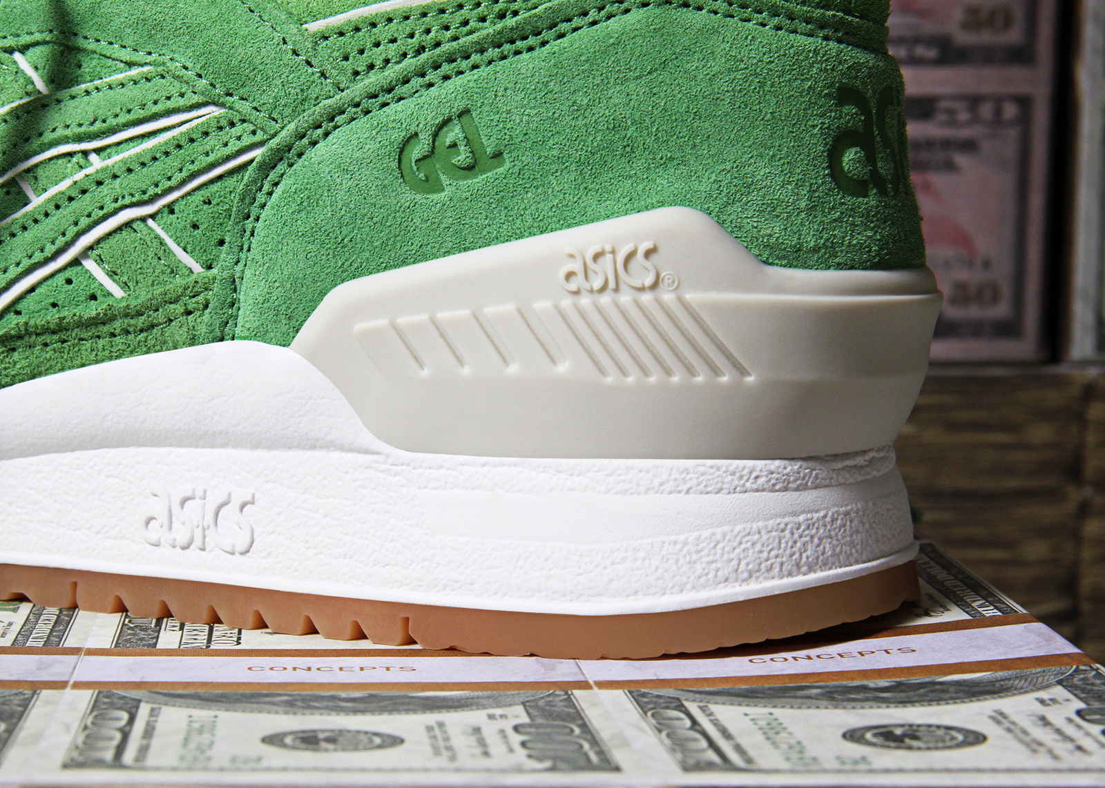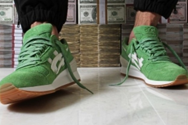 The shoe, which is the first collaboration for this retro Asics model, is inspired by the coca plant of Colombia and its infiltration of the streets of Miami in the '80s. The shoe has a tonal green suede upper, reflective paneling and Concepts branding on the tongue and insole. Pairs will come in a limited edition Concepts box made to look like a bundle of cash.