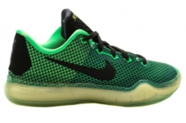 The sneaker, which appears in PS size here, draws on Kobe's early days as a Laker, specifically a dinner meeting that he had with Derek Fisher and Nick Fox where much wisdom was imparted. Were it not for the official "Vino" nickname, it would be easy to mistake the shoe for a "Grinch" redux given the volt/poison green combination.
