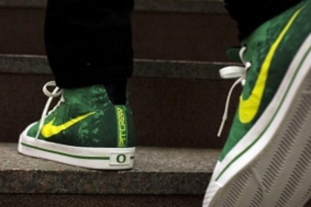 Instead, the shoe is an almost Converse Chuck Taylor-looking model complete with a Nike Swoosh across the side. The design features a Pit Crew call out along the back, the requisite Oregon "O" at the heel, and a forest graphic adorning its upper that references the court at Matthew Knight arena (a court that Tinker Hatfield designed).