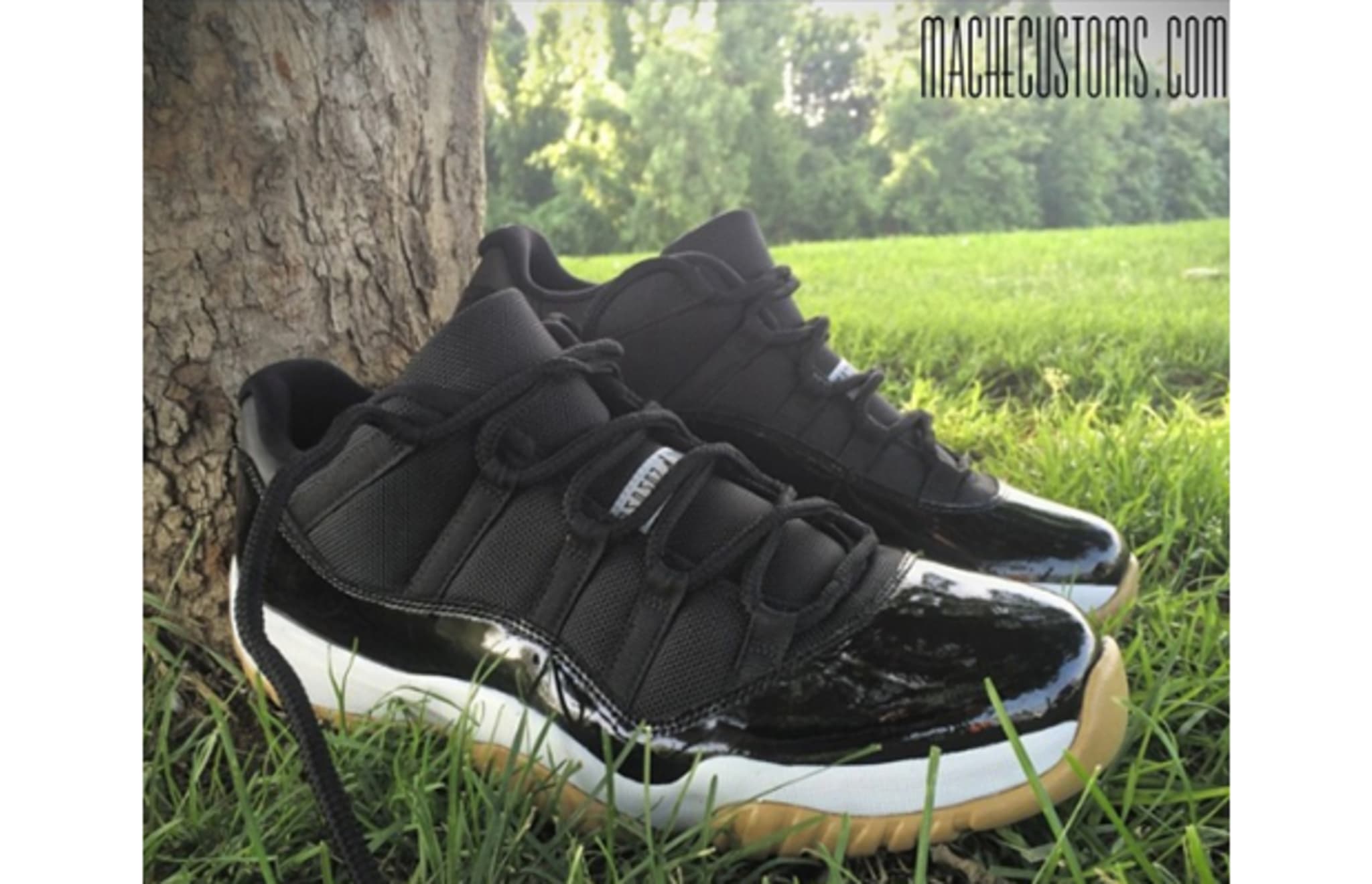 Besides the patent leather on the Air Jordan XI, another unmistakable attribute is its signature tooling, which consists of a translucent outsole. Sneaker customizer Mache takes on the signature model and adds his own flavor by way of the always popular gum bottom aesthetic. For you 'heads out there that always lose sleep over yellowing soles on XIs, this is your solution right here.