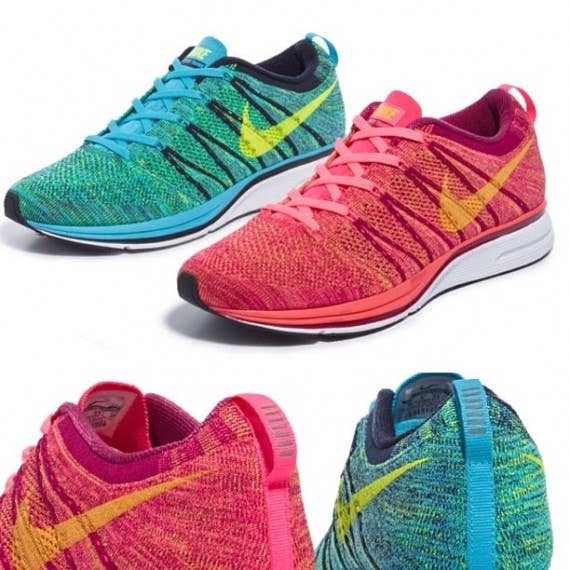 With Nike's Flyknit family of course ever-expanding, today we get a look at two colorways of the Flyknit Trainer that are slated to arrive next month. The popular Flyknit option will be presented in a blue and green look as well as a pretty pink pair. Darker Flywire has been utilized on the initial iteration to match the collar accordingly, as yellow Swoosh branding tags, and blue laces accompany. The pink pair showcases orange tagging alongside and comes equipped with lighter pink laces. Hey, ladies. Nonetheless, expect the Flyknit tandem to hit during the month of October at authorized providers.