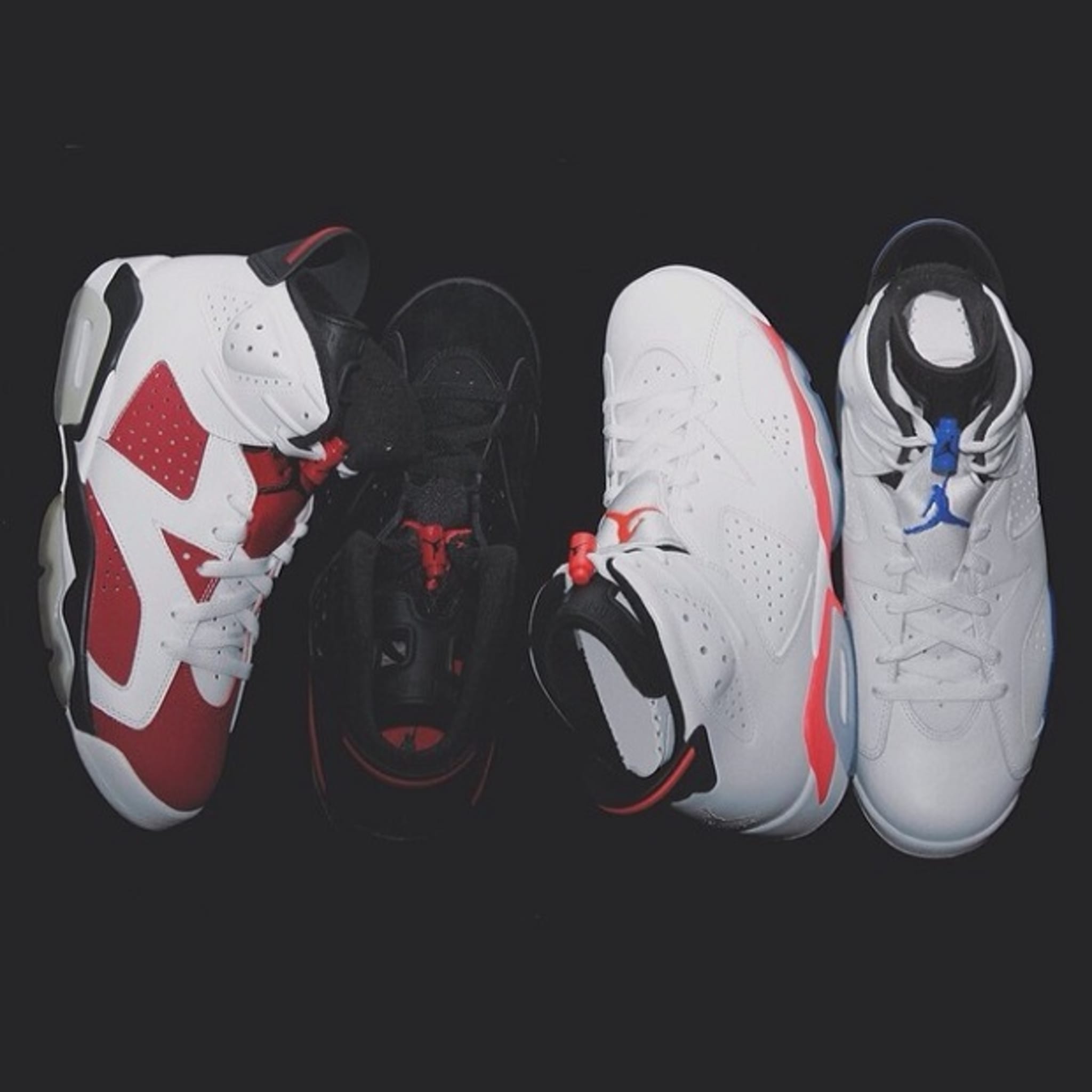 Jordan Brand has already released some Air Jordan VIs this year, and the Carmine VI is set to release this May. With the "Black Infrared" VI rumored to drop on Black Friday, we have something that could be looming as a huge release. A picture surfaced today that shows the never-retroed "Sport Blue" VI in the mix with the aforementoned sneakers. Could this be foreshadowing?