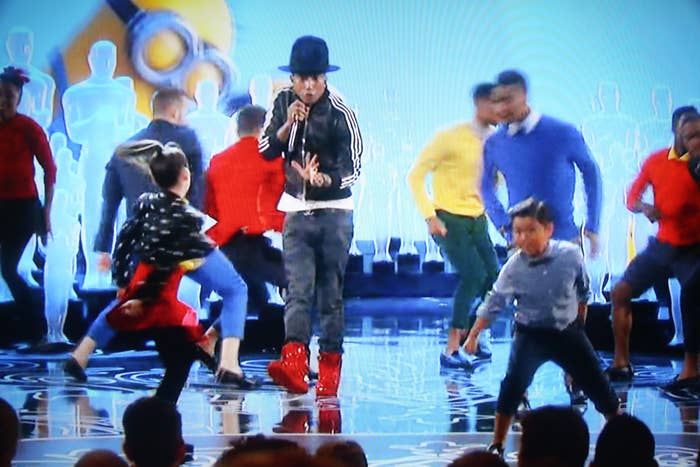 All arrows are pointing to Pharrell signing a deal with adidas, and he made it even more apparent this evening. During his performance of "Happy" at the Oscars, he wore a custom pair of red high-top adidas Originals sneakers.