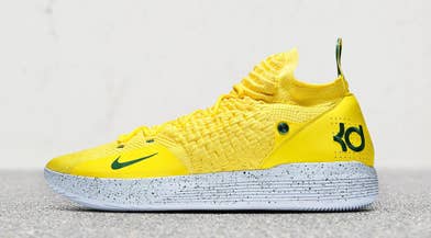The Nike KD 11 PE "Seattle Blends" features the athlete's eleventh signature sneaker in two colorways that reference Durant's first year in the league before the team moved to Oklahoma City in 2008. Each pair features the silhouette's Flyknit upper, mid-cut design, and sock-like ankle collar in bold yellow and green colorways. The look also includes complementary color accents on the Nike and KD logo branding throughout.