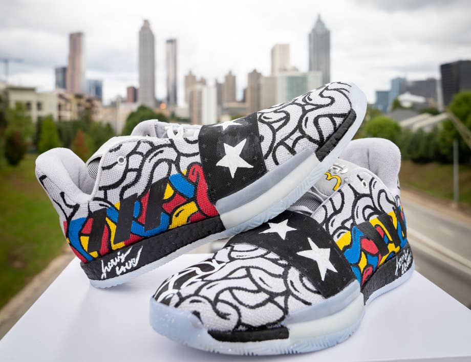 Designed by Atlanta-based artist Travis Love, the upper of the reigning MVP's third signature is covered in a black-and-white graphic with a red, blue, and yellow section by the heel. White stars have also been painted across the black midfoot strap, a red heart was added on the medial side, and the fast food chain's signature golden arches have been added to the tongue under Harden's logo. Love says the design is inspired by the shapes and colors of unity on the court.