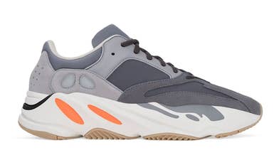 According to Yeezy Mafia, a "Magnet" Yeezy Boost 700 will be released soon. Overall, this make up is closest to the OG "Wave Runner" Yeezy Boost 700 with a grey-based colorway and orange accents on the midsole. But unlike the "Wave Runner" version, this new "Magnet" variation forgoes the blue paneling for a dark grey portion at the toe. Additional details of note include a gum rubber sole and a frozen yellow liner.