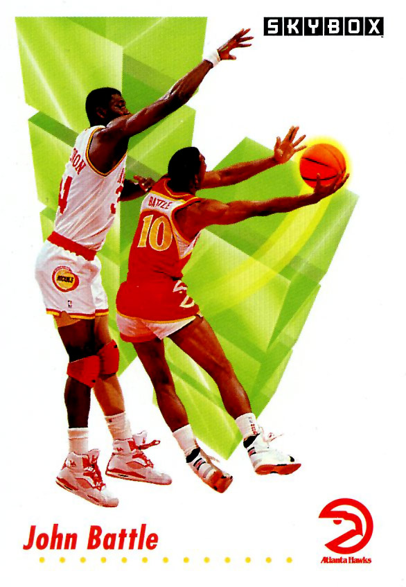 Up first is the aforementioned Hakeem Olajuwon along with John Battle with two sneaker brands you don't normally see at all, yet alone on the same card: LA Gear and K-Swiss. John Battle was one of the few players in the NBA to ever wear K-Swiss during their short stint in the basketball market. As for The Dream's LA Gear's, they look like a rip-off of about two of three different Nike shoes including the Air Flight '89 and Air Jordan V. LA Gear was notorious for "borrowing" inspiration for their designs from Nike and Reebok. Look up the LA Gear MVP-1 if you don't believe me.