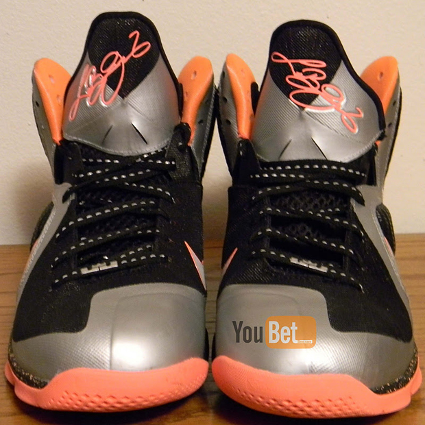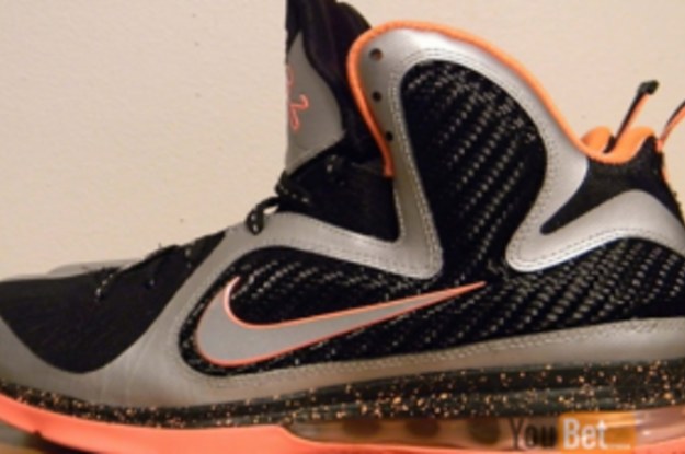 Creating the unique colorway, we see black and metallic silver combing throughout the LeBron 9's synthetic upper. Hits of bright mango bring these bad boys to life, handling the tongue signature, liner, midsole splatter, Swoosh outline and the outsole sitting down below.