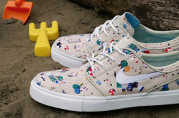 Inspired by those hot days when the only thing to do is cruise the boardwalk, cool off in the water, lay on the sand and recharge until the sun starts to dip. This 'Beach' Nike SB Zoom Stefan Janoski comes in a multi-color, sandtrap and white colorway. Featuring an all-over graphic print from a bird’s eye perspective as towels, toys and tan lines pop off the sand-based premium canvas upper, like confetti. Accompanying apparel will be released alongside the sneakers, providing the ultimate hook-up.