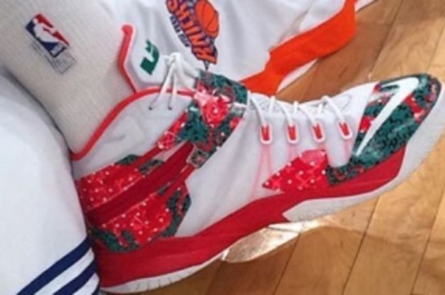 You've probably seen most of the exclusive Christmas sneakers worn this year already, but there's one you may have missed that was worn by the Knicks' Jason Smith. These LeBron Soldier 8s feature white uppers with a festive holiday print, similar to the pair of Hyperdunks worn by Smith's teammade Samuel Dalembert. The shot shared by Smith can be seen below.
