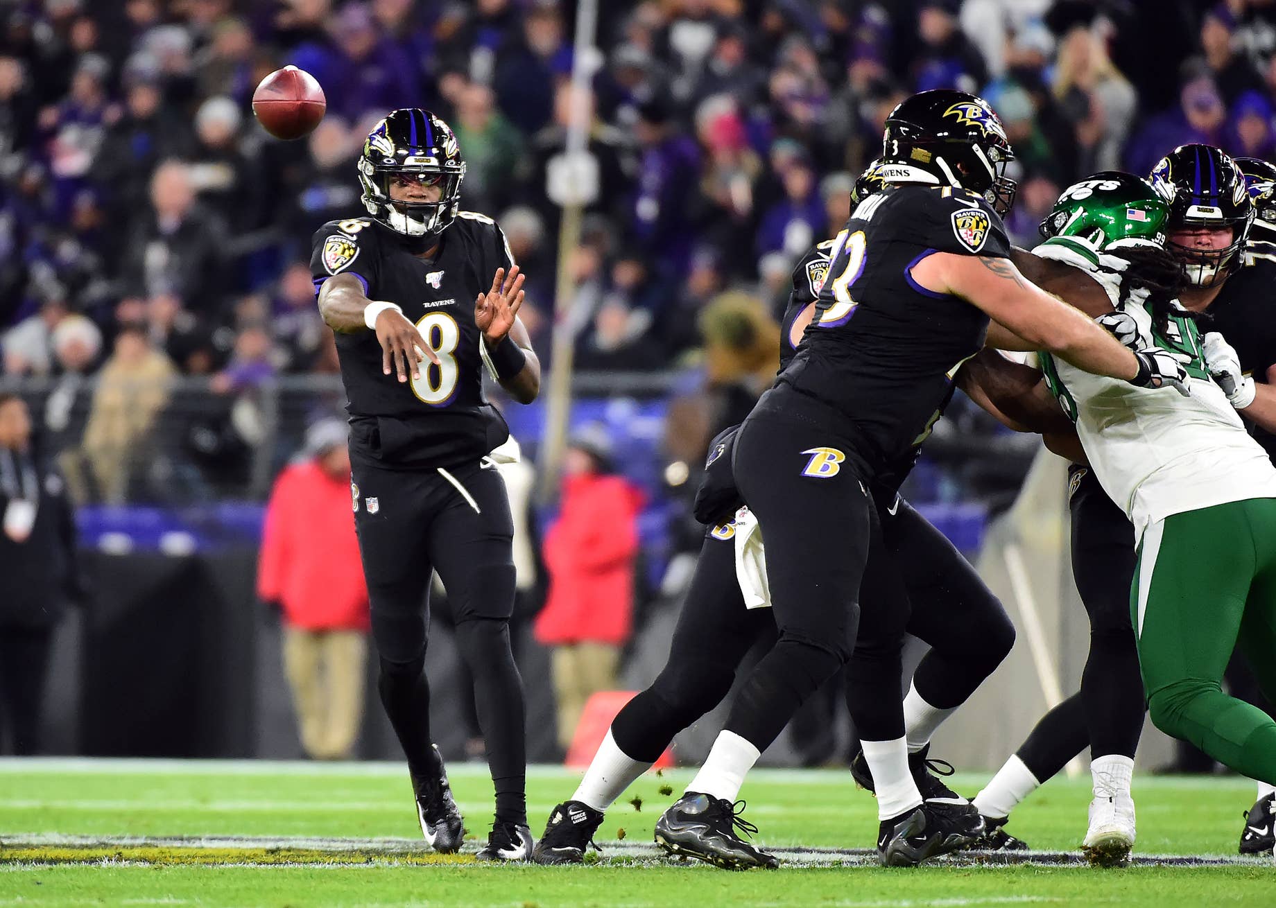 Dec 12, 2019; Baltimore, MD, USA; Baltimore Ravens quarterback Lamar Jackson (8) throws a pass in the first quarter against the New York Jets at M&T Bank Stadium. Mandatory Credit: Evan Habeeb-USA TODAY Sports