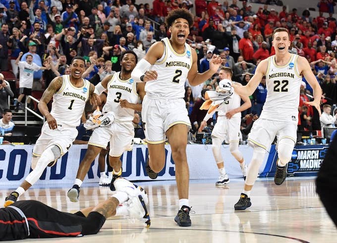 Fortunately, one dramatic late finish saved me from crossing off one of my Final Four teams, as Michigan rallied past Houston, 64-63. The Wolverines were down, 63-61, and fouled the Cougars with 4 seconds remaining. Houston's Devin Davis missed both free throws, though, and then...well, just watch.