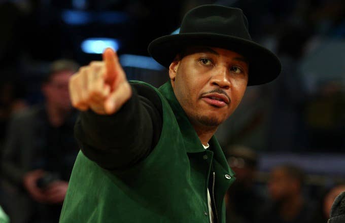 Even though he's not playing for the Knicks right now, Carmelo Anthony has been spending a lot of time with his teammates in recent weeks. He has routinely taken the court before home games to stretch. He's been a fixture in the Knicks' locker room. And while the Knicks have struggled—a lot—without him, he has seemingly continued to show support for them. However, there's one thing that he hasn't done since going down with a season-ending knee injury back in February: Sit on the Knicks' bench during games.