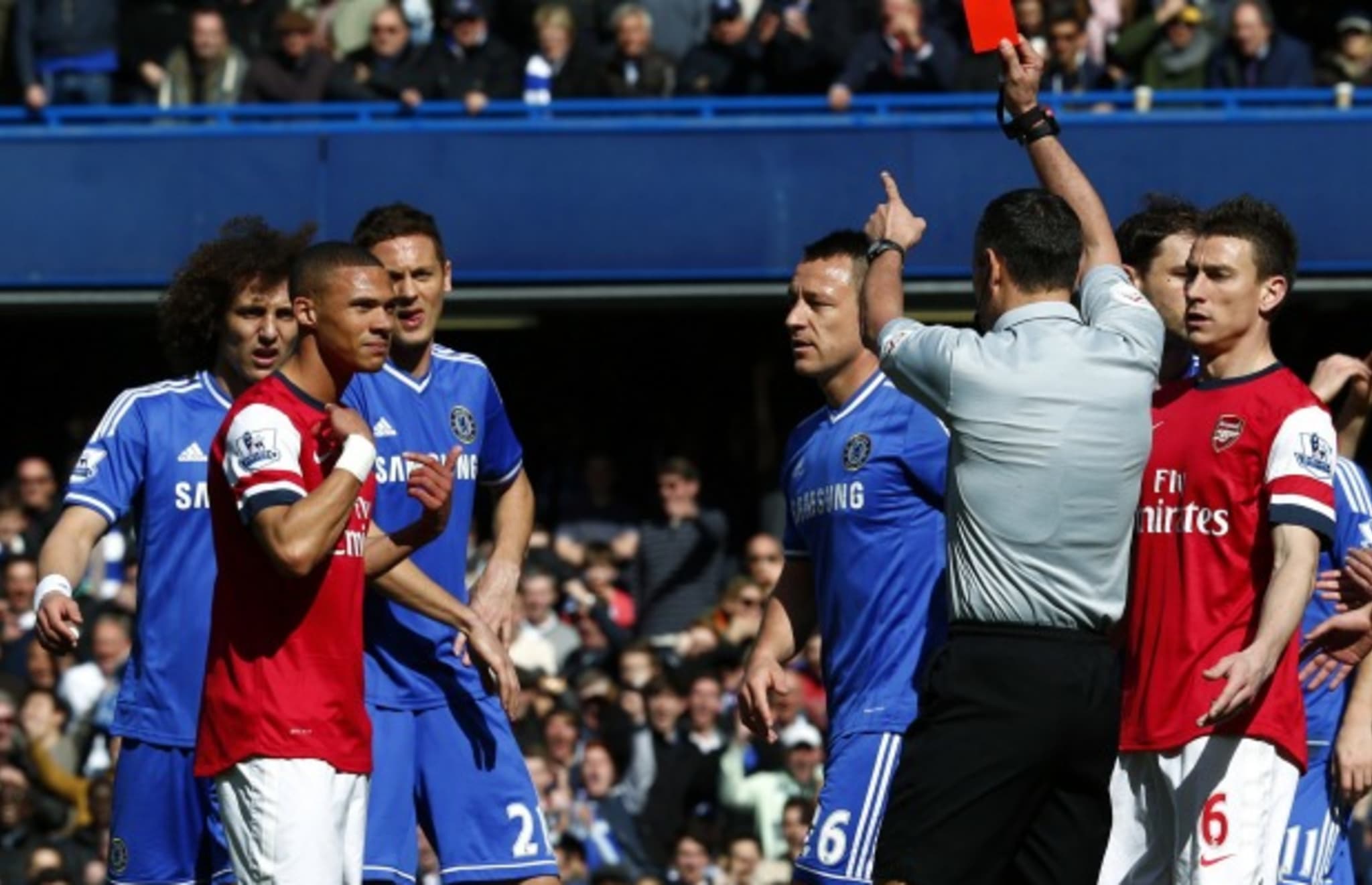 That's obviously not allowed, though. So Marriner whipped out his red card and prepared to remove Oxlade-Chamberlain from the game. Only, he didn't give the red card to him. In a strange twist, he gave it to Oxlade-Chamberlain's fellow black teammate Kieran Gibbs. Oxlade-Chamberlain tried to plead his case with Marriner and tell him that he was the one who touched the ball:
