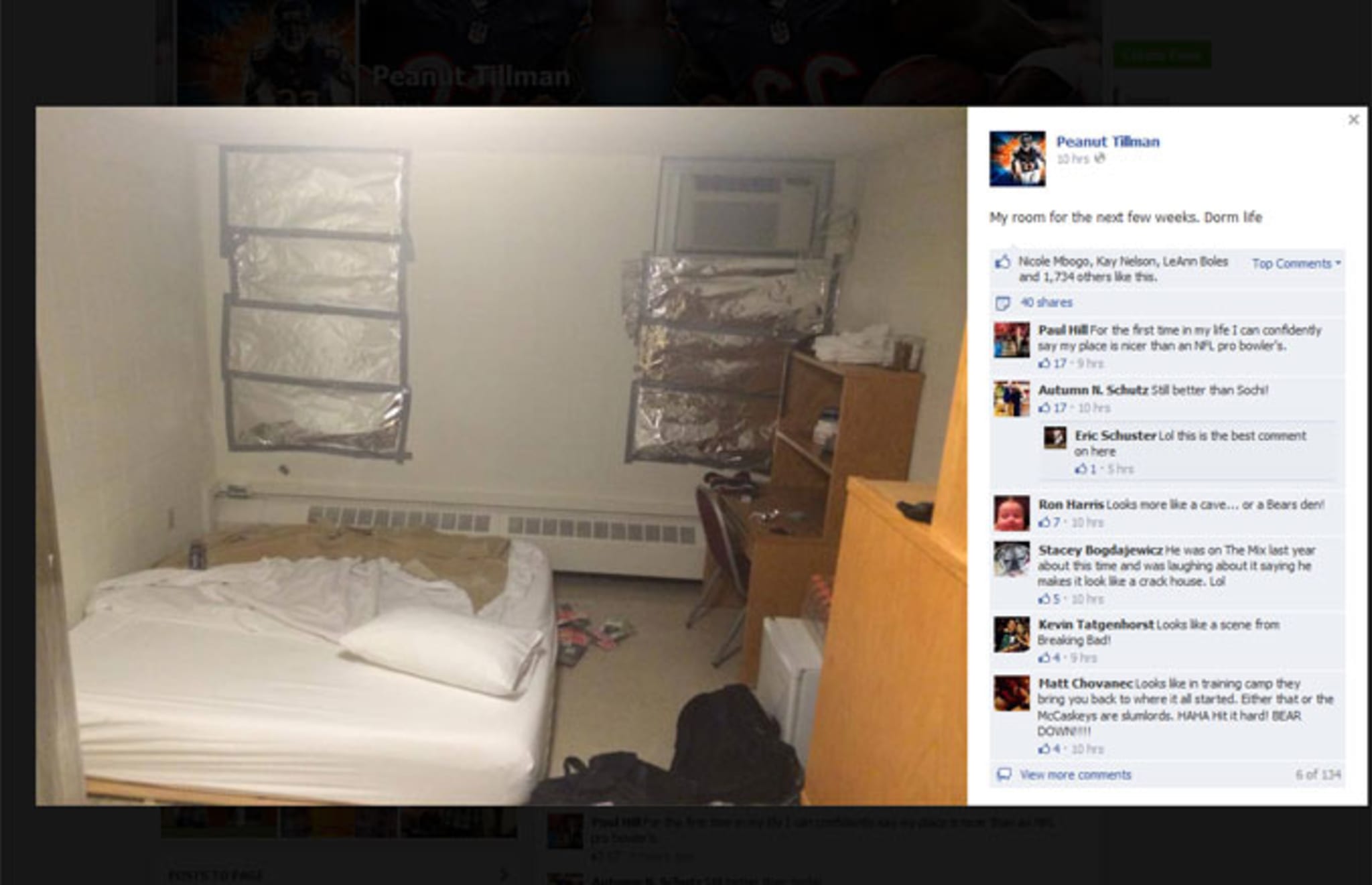 Remember how Brett Favre waffled on retirement for years before ultimately deciding to come back a few weeks before the season starts? Pretty much everybody realized that the grizzled vet just didn't want to spend a month a year wallowing in the misery that is NFL Training Camp. For example, take a look at Charles Tillman's (who's beginning his 12th season) setup for the foreseeable future paired with the caption "My room for the next few weeks. Dorm life." We know Training Camp is supposed to be about getting you totally prepped for the upcoming season but damn, can't an NFL franchise do better than a crack den?