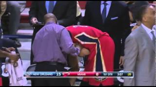 Anthony Davis couldn't lift his arm. Hurt shoulder. Appeared in severe pain. Off to locker room. http://t.co/KuRr8ZNma2