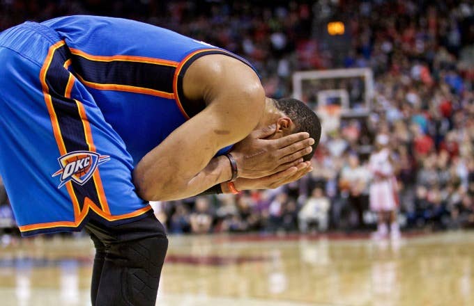 The Oklahoma City Thunder can't catch a break. After running in to teammate Andre Robertson's knee in a game against the Portland Trail Blazers last night, which gave the dude an actual dent in his face, it was discovered Russell Westbrook has fractured his cheek. Today, Yahoo Sports' Marc J. Spears is reporting that Westbrook went through a procedure to treat the injury, and will be re-evaluated next week.