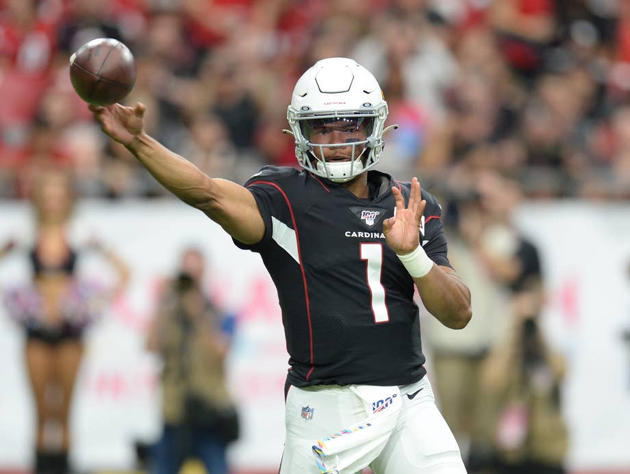 Oct 13, 2019; Glendale, AZ, USA; Arizona Cardinals quarterback Kyler Murray (1) throws a pass against the Atlanta Falcons during the first half at State Farm Stadium. Mandatory Credit: Joe Camporeale-USA TODAY Sports