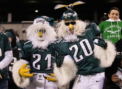 Philadelphia Eagles fans in costume cheer on before action against the New York Giants at Lincoln Financial Field.