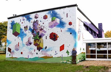 Alessandro Battisti, aka Etnik spent a few days in Dusseldorf painting this wall with color 3D shapes floating in a blue sky. The composition makes the objects seem as if they are pieces of a whole, exploded and captured mid-scatter. The blend of 2D and 3D elements is very similar to the world of Fez, a platform puzzle game that won the "Excellence in Visual Art" award at 2008's Independent Games Festival. What Fez achieves with computer graphics, Etnik does with paint and a very sophisticated eye for perspective.