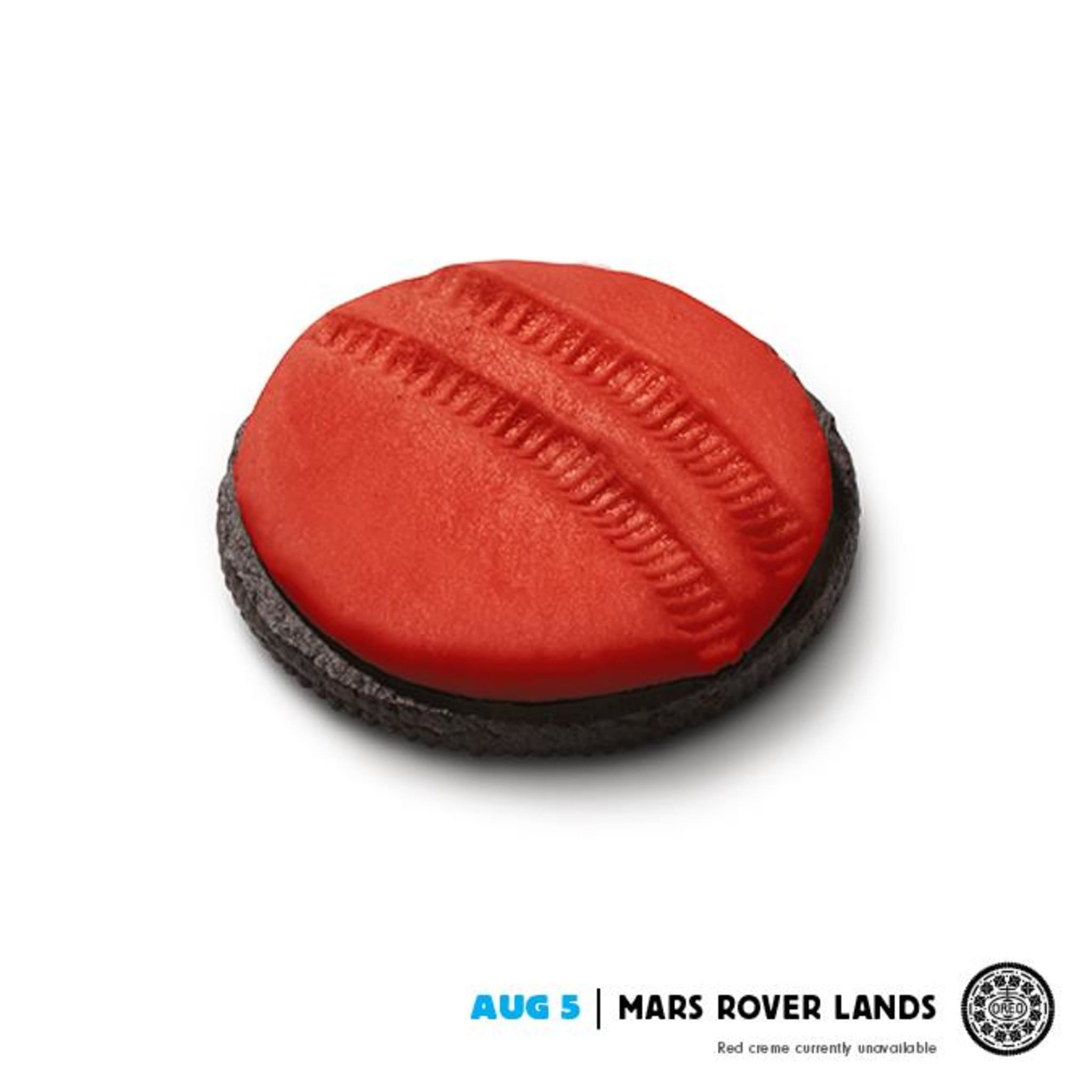 Oreo surprised everyone with one of their daily pop culture ads celebrating the Mars Rover, Curiosity, landing. While the red cream shown in the ad isn't available in real life, we can all agree that it's pretty clever. Click through the thumbs to see other recent ads and like Oreo on Facebook to see more.