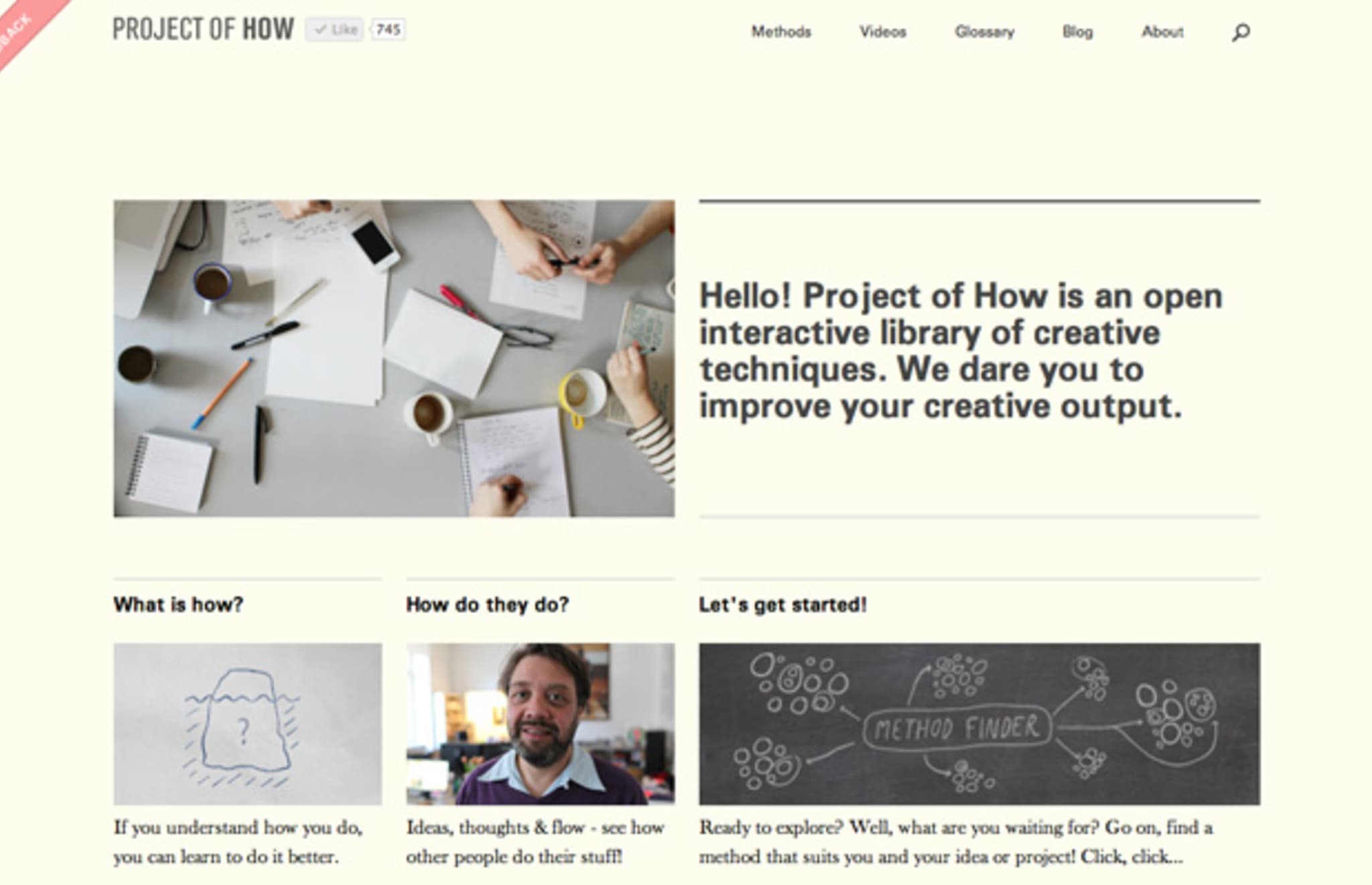 With the intention of having a place to store and share learnings and insights around good creative methods, the Project of How already has 13 methods from "Idea voting" to "Brainstorming" and "Feedback for Dummies." Despite the loftiness of their goals, Project of How seems quite poised to achieve them. [ProjectofHow]